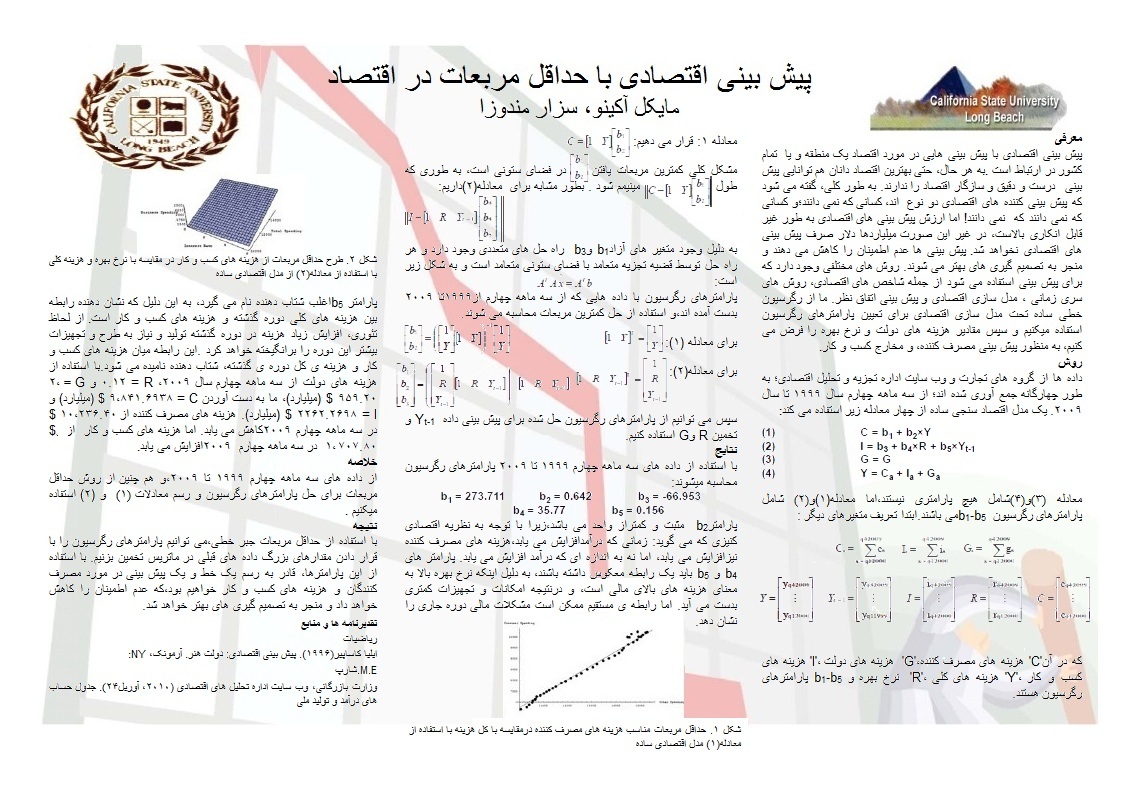این پوسترو شخص بنده ارائه دادم ولی استاد اصلا راضی نبودن! چون نسبت به بعضی از مطالب تسلط کافی نداشتم! اگه کسی در راه رضای خدا بتونه مفاهیم اقتصادی این پوستر و توضیح بده ممنون میشم! تا 28 اردی بهشت مهلت گرفتم که اصلاح کنم ندونسته هامو! هر چند یکی از استادا که دانشجوی دکترای اقتصاد هستن بهم گفتن اما من نفهمیدم چی شد!؟ البته مفاهیم جبری (آنالیز عددی) در این پوستر هست که تقریبا جدیده ولی چندان پیچیده نیست؛ ترجمه اش یکم وقت گیر بود ولی بد نبود؛ ضعف ارائه بنده مربوط به مباحث اقتصادی بود...
